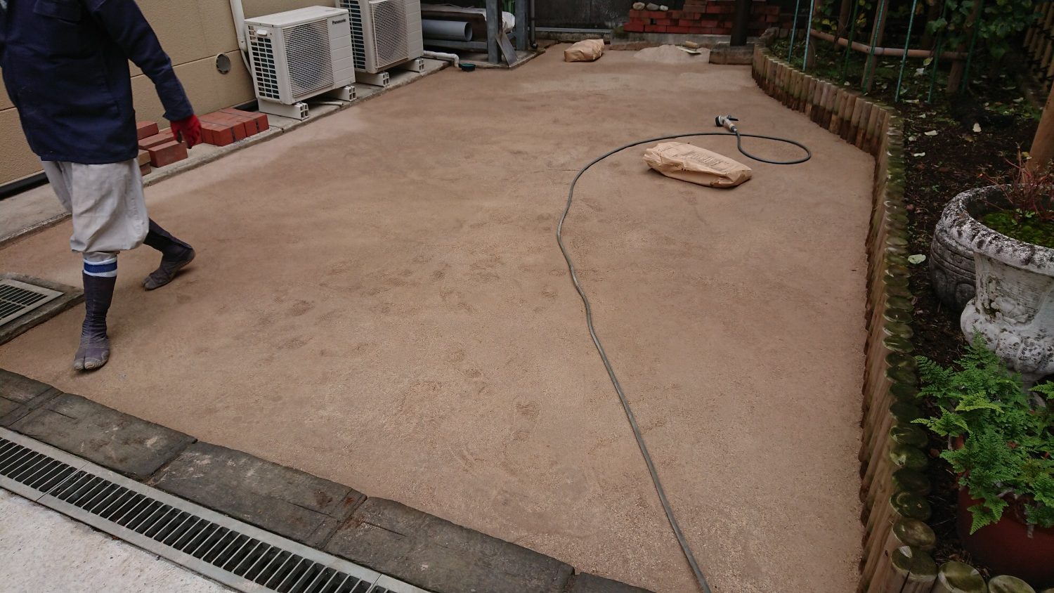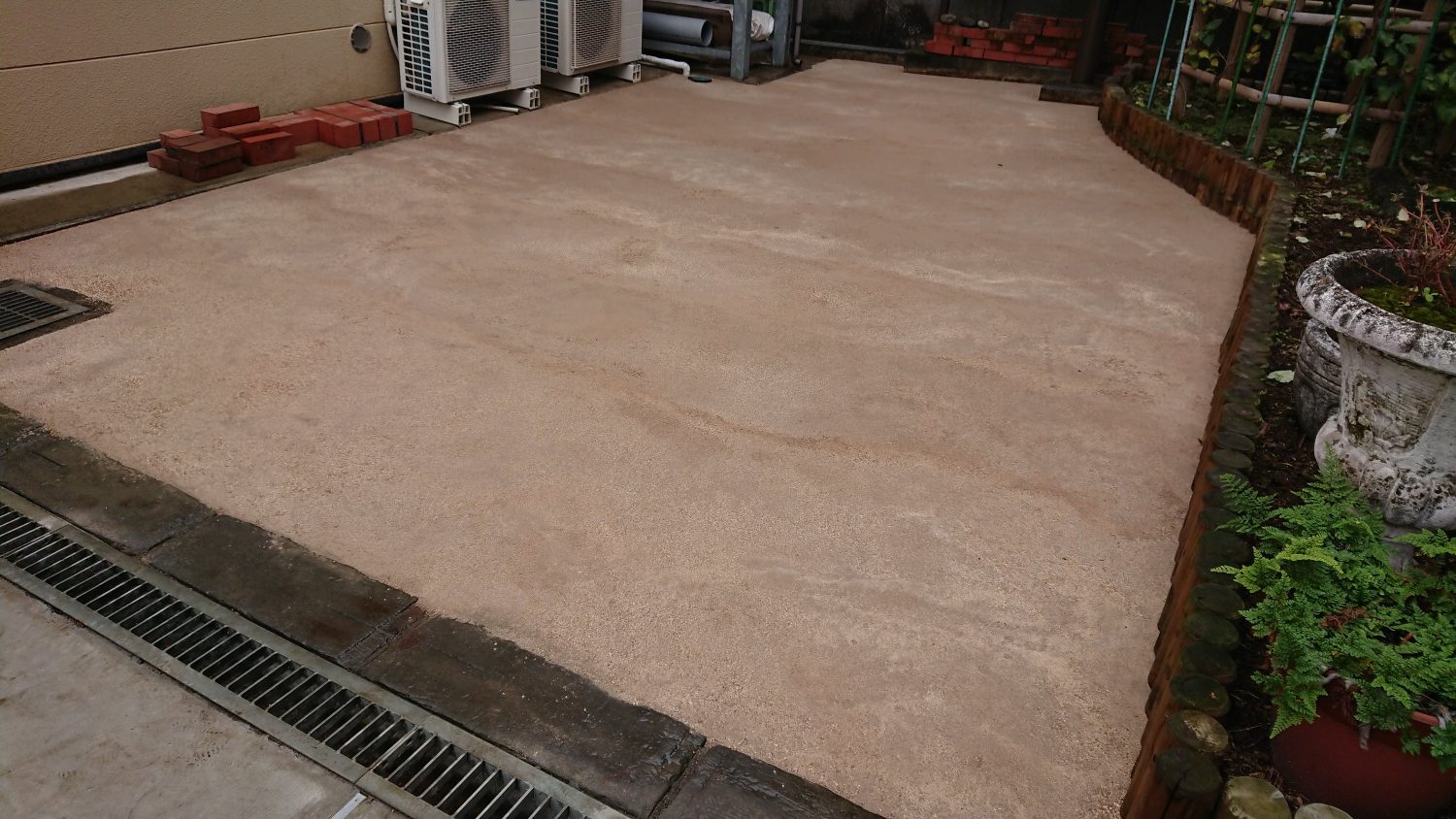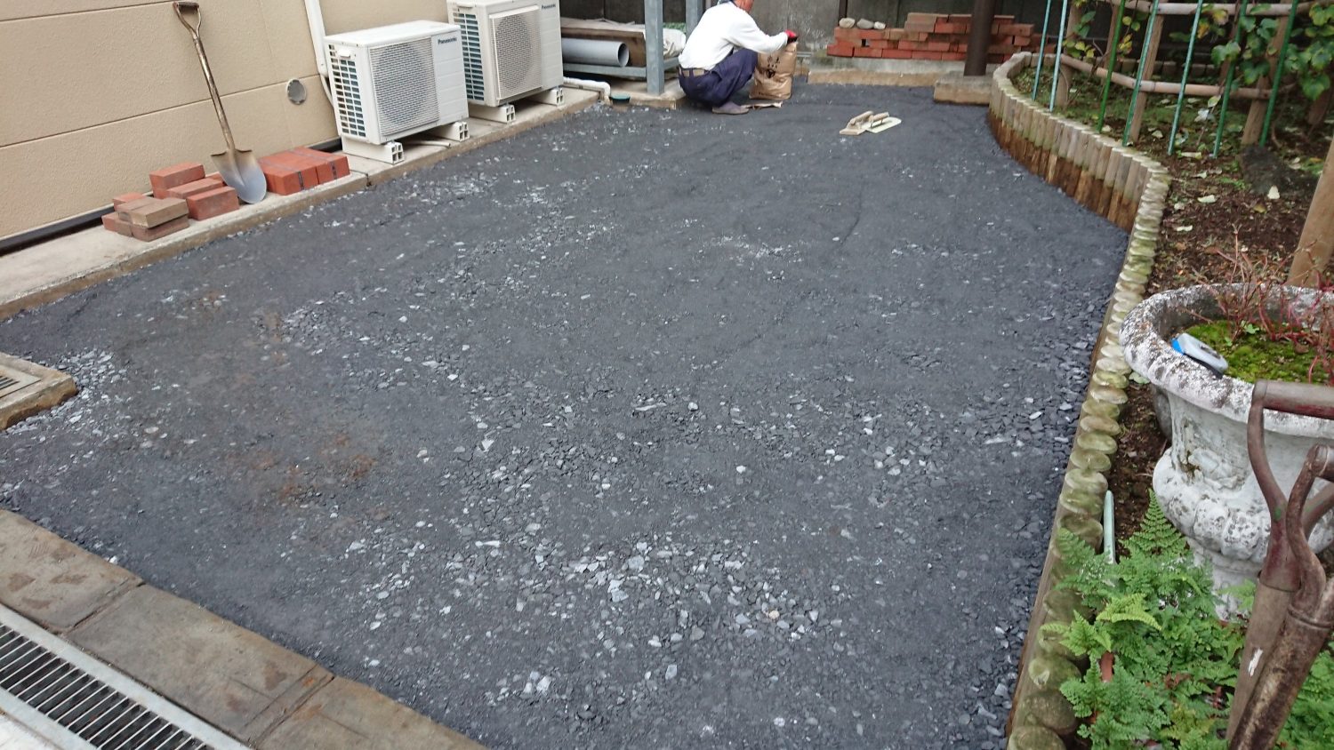 外構工事、エクステリア、造園工事に対応しています。鳶中嶋です。今回は前回の続きで楽土舗装します。砕石を敷いてよーく転圧します。ここで転圧が不十分だとひび割れや凹んでしまいます。今回の楽土は厚さがあったので二回に分けて施工しました。仕上がりが綺麗になるようにならしました。このほかにも砂利敷き、コンクリートなどいろいろ対応しています。何かありましたご相談ください